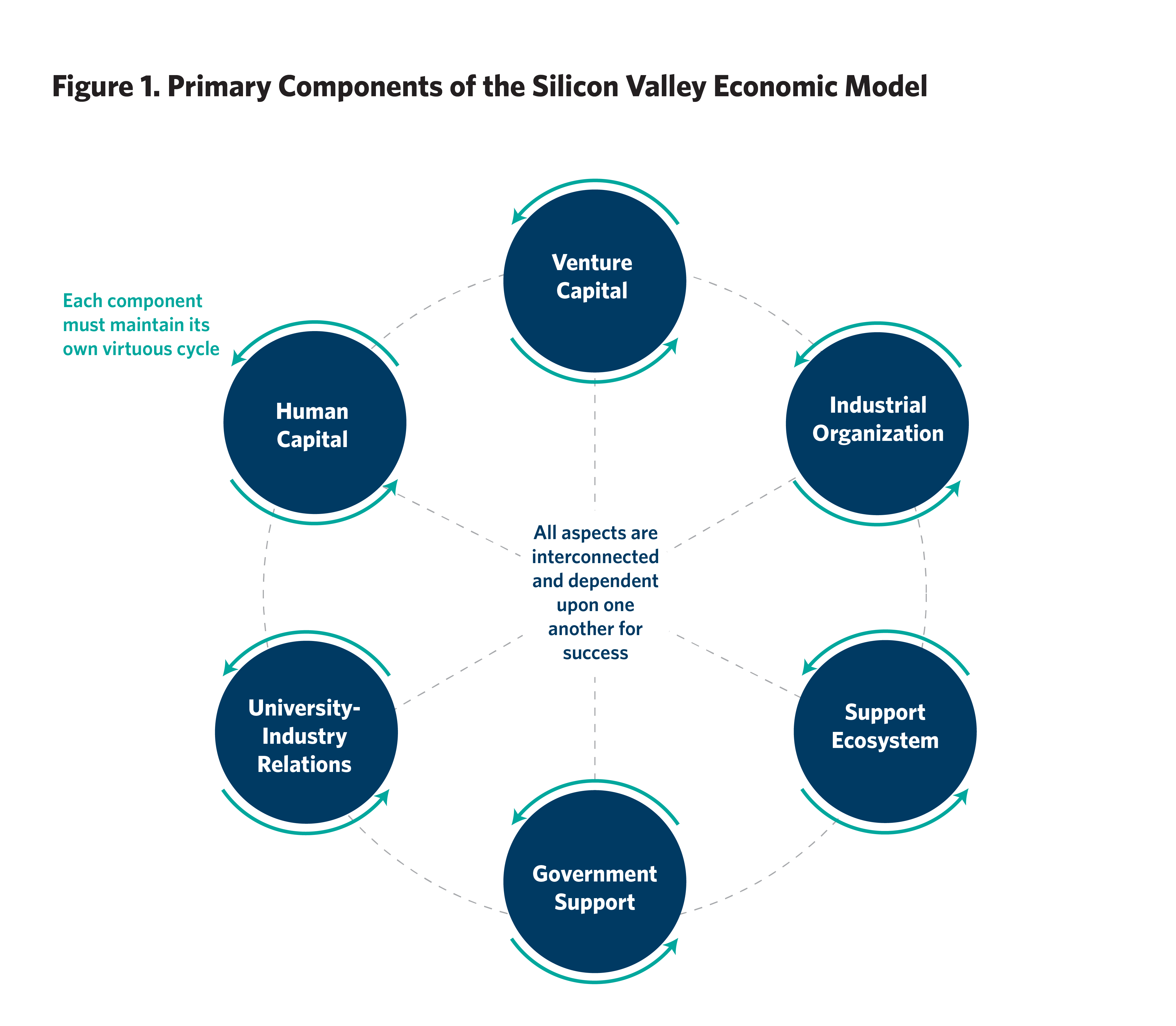 • It can be distilled into its primary components: (1) venture capital, (2) human capital, (3) university-industry ties, (4) direct and indirect government support, (5) industrial structure, and (6) support ecosystem of professional service firms.